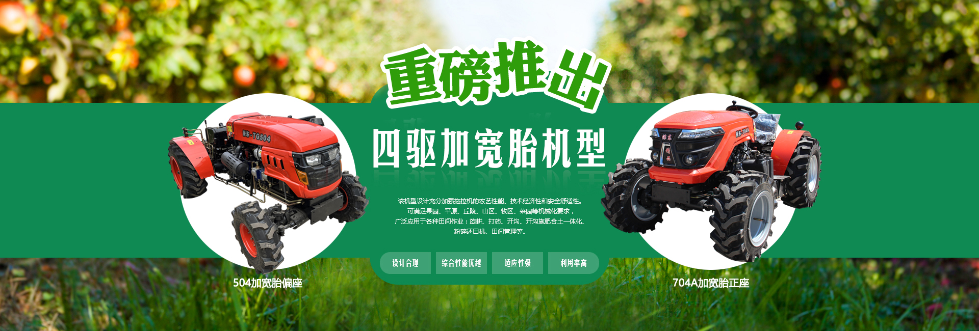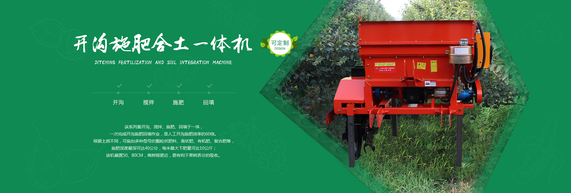 我公司主要經(jīng)營產(chǎn)品有:果園管理機(jī)、拖拉機(jī)(窄距拖拉機(jī)、小型拖拉機(jī)、輪式拖拉機(jī)、山地拖拉機(jī)、四驅(qū)拖拉機(jī))、果園施肥機(jī)(開溝施肥合土一體機(jī)、偏置開溝施肥復(fù)土一體機(jī))、打藥機(jī)(風(fēng)送噴霧打藥機(jī)、小型風(fēng)送噴霧打藥機(jī)、大型風(fēng)送噴霧打藥機(jī)、果園打藥機(jī))、開溝機(jī)(中開溝機(jī)、偏置開溝機(jī)、果園開溝機(jī))、粉碎還田機(jī)、果園打草機(jī)、碎枝機(jī)(大型碎枝機(jī)、開荒機(jī)、山地開荒機(jī))、旋耕機(jī)(1米旋耕機(jī)、1.2米旋耕機(jī)、1.3米旋耕機(jī)、1.4米旋耕機(jī)、1.5米旋耕機(jī)以及偏置旋耕機(jī))、雙鏵犁等。不斷研制出適應(yīng)國內(nèi)現(xiàn)代化果園需求的果園裝備系列產(chǎn)品,并取得國家多項(xiàng)專利。