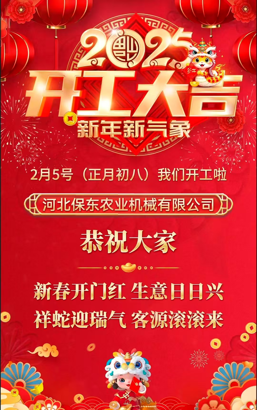 靈蛇騰云開盛景春風(fēng)浩蕩展宏圖只爭朝夕加油干斗志昂揚(yáng)創(chuàng)未來正月初八 河北保東開工大吉!在新的一年里河北保東將一如既往為廣大果園、大棚